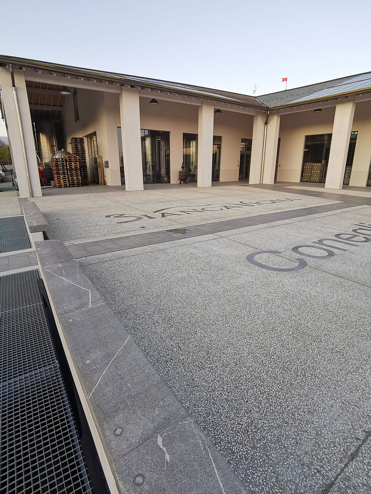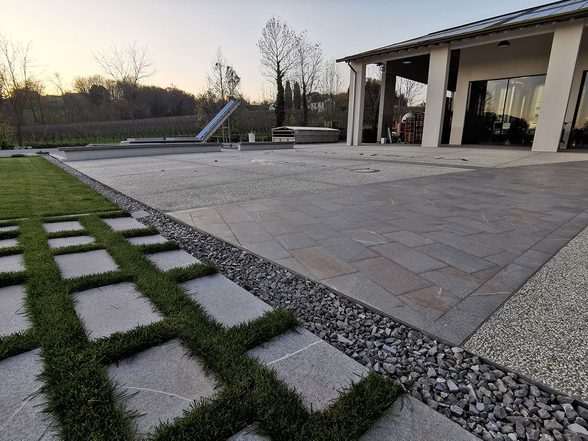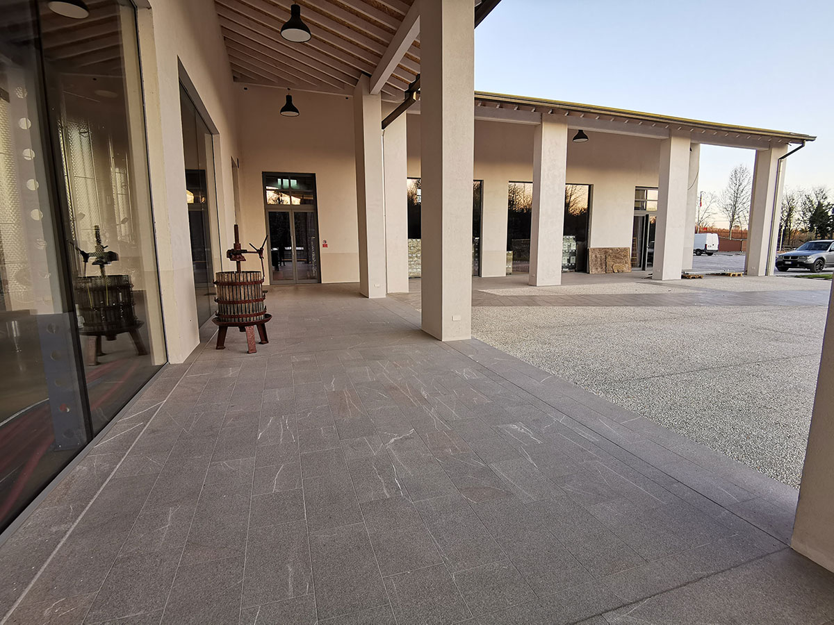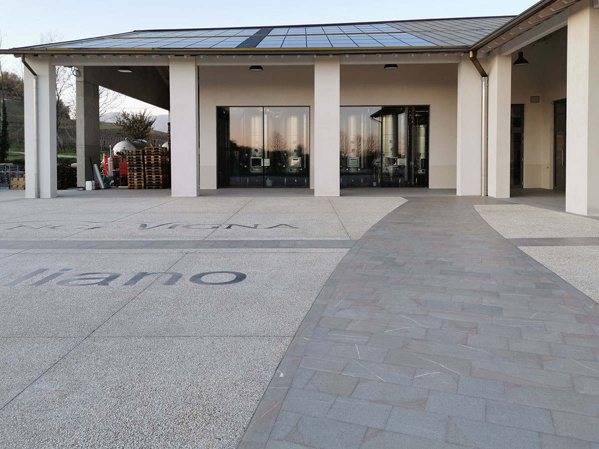 La Piasentina in questo progetto dimostra la sua duttilità nell’impiego. Utilizzata per i pavimenti dei sottoportici, per decore l’ingresso azienda, per le copertine dei muri e per il calcestruzzo in lavato con graniglia macinata dell’ingresso mezzi. La ditta CUDICIO interessata nel riciclo dello scarto e a nuovi impieghi decorativi nel riusare la Piasentina anche per pavimentazioni tecniche.